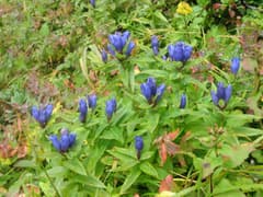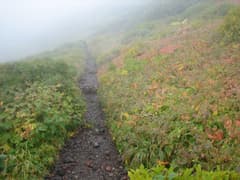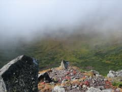 森林限界を超えて草原が広がっている。夏ならば高山植物がたくさん咲いているところだろう。今は、ガスの中に黄色や赤に色づき始めた葉がぼぅーっと滲んでいるだけだ。