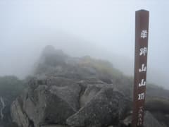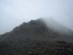小広いガレ場となって九合目に到着。ここで森林限界を超えたようで、風が強い。休憩していると、雨具なし半袖姿の女性がささーっと登ってきて、頂上へ向かって行った。寒くないのかしらん(@_@)。私の方は、ここで濡れて風に吹かれたらやばい、などとさっきから考えていたのだが。まぁしかし、ここまできたら頂上へ行くしかないでしょう。右に羊蹄小屋への道を分け、左の頂上への道を登る。