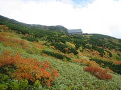羊蹄小屋に立ち寄ってみたいので、鞍部から真狩コース九合目まで下る。周辺はハイマツの緑の中に点在する紅葉が美しい。この頃から、急速に青空が広がり始めた。