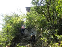 モミやミズナラの大木が鬱蒼と茂る急な山道を登ると、やがて尾根の上に出て、見上げると舞台造りのお堂(文殊堂)がある。お堂の直下はちょっとした岩場で、お堂に直接登る鎖場と、捲き道に分岐する。ここは迷わず鎖場へ。西上州で鍛えられているので、大したことはないv(^^)
