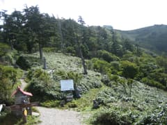 9月の平日とあって登る人は少ないが、それでも頂上からぱらぱらと降りて来るハイカーさんと行き会う。大剣神社への道を右に分け、鹿除けのネットをテキサスゲートで越える。刀掛の松で道は三方に分かれる。右は大剣神社へ。左はキレンゲショウマの群生地を経由する道だが、今は花の時期ではないので、頂上への最短コースとなる真ん中の道を通る。