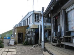 リフトの下をくぐってなおも登ると笹原の斜面が広がり、リフト終点の西島駅に着く。行く手には剣山山頂の雲海荘がすぐそこに見えている。