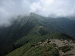 三角点は砕石を土俵のように積み上げた中に鎮座していて、ご丁寧に注連縄まで土俵俵のように巻かれている。頂上はガスに覆われていたが、やがて青空が広がって、隣りの次郎笈へ続く緑のビロードのような稜線が垣間見えた。