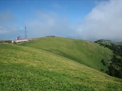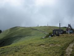 頂上は平家の馬場と呼ばれる平坦な笹原で、その中に(今は使われていない?)測候所が建つ。測候所を廻り込んで、笹原の中に設置された立派な木道で三角点まで歩く。笹原の中には現役を引退した気象観測用鉄塔が点々と残存し、シュールな眺めだ。
