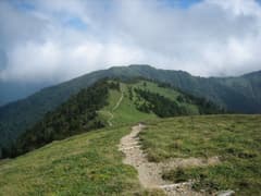 前社ヶ森から下り切った鞍部には売店があるが、平日なので休業。再び樹林の中の登りとなり、一つピークを越すと笹原の尾根になって、夜明(よあかし)峠に着く。標高差でちょうど半分のところだ。行く手には石鎚山の頂上稜線が屛風のように立ちはだかる。かかっていたガスも徐々に晴れて、頂上社や途中の小屋も見えて来た。