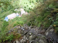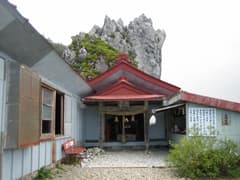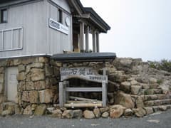 三ノ鎖を登り切ると、頂上社の裏手に直接這い出た。頂上社にはたくさんのハイカーさんが居て、ちょうど晴れ間が広がって見えて来た周囲の景観を楽しんでいた。頂上社の裏手には奇麗な頂上山荘がある(H15年7月リニューアル)。宿泊には通常は予約が必要なようだが、今日は予約なしで可との掲示があった。山岳リゾートには絶好のポイントで、ちょっと泊まりたくなった。