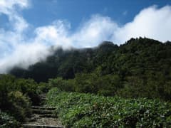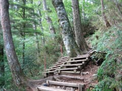 成就社の登山口の山門をくぐると、樹林の中の緩い下りが八丁まで続く。途中で石鎚山遥拝の鳥居をくぐる。木の間越しに石鎚山の山頂を伺うが、まだ雲の中のようだ。八丁からはいよいよ本格的な登りとなるが、石鎚山の表参道だけあって、木の階段が良く整備されていて歩き易い。