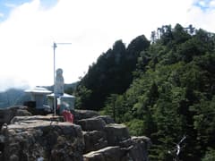 ところどころから左手に見える穴吹川流域の谷は、深い森林に覆われている。木の鳥居をくぐると剣山本宮と剣山頂上ヒュッテが並んで建ち、その間の階段を登ると剣山頂上の一角に出た。