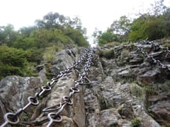 続いて、三ノ鎖(ここも捲き道あり)。垂直の岩場に見えて、ちょうど先行している人が鎖場上部を登攀中だ。ちょっとビビる。鎖場の下には売店があり、今日は開店していないが、営業していたらお茶して落ち着きたい所だ。