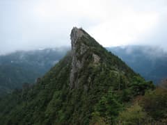 前社ヶ森の頂上は切り立った岩峰で、地蔵と石祠が建つ。眺めが良く、振り返ると成就社や遠くにはうっすらと瀬戸内海の島影が見える。石鎚山の方向はまだ雲の中だ。前社ヶ森からは反対側(進行方向)に下る。ここも長い鎖場で、下に着いたときは体力をだいぶ使っていた。