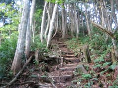 笹が良く刈り払われた道を進み、湯沢を渡ると、暗く湿ったアスナロ林の尾根の急な登りとなる。テント泊装備(約14kg)を背負っているので、ゆっくり登る。