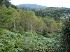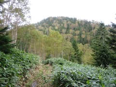 こちらの道も良く刈り払いされている。最初はいくつかの水流を跨いで緩く下るが、やがてダケカンバなどの樹林の中を傾斜を増して下り始める。あちこちに錆びた太いワイヤーが放置されているところを見ると、かつては林業が盛んな場所だったようだ。