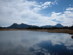 鬼怒沼は枯れ草原が広がって、木道がその中へ伸びている。爽快な風景だ。木道を歩いて行くと、一番大きな池塘(金沼)があり、周囲の山を水面に映している。