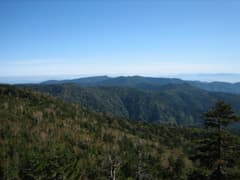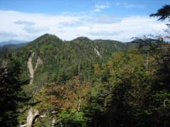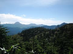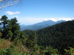 やがて明るい尾根となり、ところどころで展望も開けて、燕巣山や直線的な稜線が特徴の四郎岳が見える。振り返ると大清水と、その背後に荷鞍山の三角形のピークが望まれる。