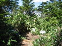 鞍部に下って、黒岩山への斜面を緩く登ると黒岩清水がある。テントサイトもあるが、湿っぽく、雨が降ったら浸水確実なので、あまり泊まりたくない場所だ。さらに登ると「尾瀬沼方面 5時間←黒岩山→奥鬼怒方面 3時間10分」と書かれたプレートのある地点に着く。赤テープの付いた踏み跡が右に分岐して、黒岩山の頂上に向かっている。