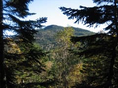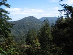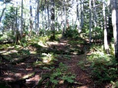 一旦、鞍部に大きく下って、登り返す。左手には物見山の奇麗な三角錐のピークがすっくと聳えている。しばらく笹の混じる明るい尾根を登るが、登り着くと再びオオシラビソ林の中で、高原のような緩い稜線歩きになる。