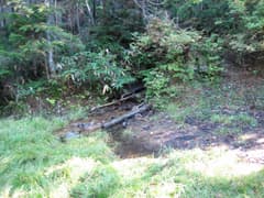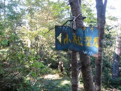 ほぼ平らな稜線が続いたあと、やがて下り始めたので注意して見ていると、「小松湿原」と書かれたプレートが左手の木に架かっているのを見出だす。直ぐ下に湧き水があり、その先の樹林の中に2、3張り分のテントサイトがあった。まだ誰も来ていない。