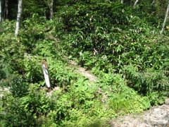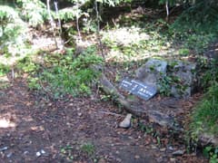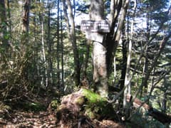 やがて急な下りとなり、ガレた小沢に出る。ここは小沢を下ると「小淵沢田代入口」と書かれた古い道標が建つ林道に出た。