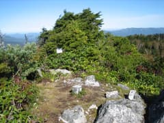 頂上は小さな平地に露岩が点在して、遠くから見たなだらかな山容からは平らな場所を想像していたが、南北に細い稜線上にある。北が樹木で遮られる他は360度の展望で、期待以上の眺めの良さに感動する。