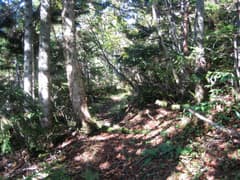 踏み跡に入ると、最初は山腹をトラバースして行くが、やがて左へ斜面を登って、稜線に出る。樹林が密に繁茂し、踏み跡がなければ到底歩けそうにない。ツツジ類の紅葉を見ながら登り詰めると、黒岩山の頂上に出た。