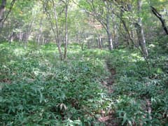十字路を直進すると、一部、笹がかぶさる区間があるが、すぐに林間の背の低い笹になり、急斜面を一直線に登り始める。道にはドングリがたくさん落ちている。この夏の猛暑のせいか、ドングリは丸々と太っていて、これなら熊も冬ごもりの食べ物は安心じゃなかろうか。