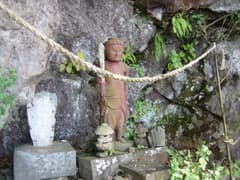 左上に岩場を見て、急坂をさらに登り詰めると、気になるスポットの鍋破山前不動がおわす大岩に着いた。憤怒の表情だが、体型というか、お姿は素朴でユーモラスだ。不動様の前は木立が開いて、今日は霞みがかかっているが山麓が見渡せる。不動様が睨む先は何処だろう。