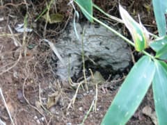 前不動から、少し古いトラロープが下がる急斜面を登る。単独のハイカーさんが降りて来て、すぐ先の地面に蜂の巣がある、掘る道具があれば持って帰るのに、とおっしゃる。見ると、直径30cmくらいの穴の中に蜂の巣があり、黒い蜂がたくさん蠢いている。帰宅後に調べるとこれは地蜂(クロスズメバチ)で、幼虫が珍味として食されているらしいが、その場ではそれどころではなく、急いで通過する。