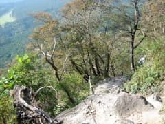 鍋割高原の末端からは岩場の多い急斜面を大きくジグザグに下る。ところどころにお助けロープが下がっている。