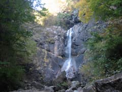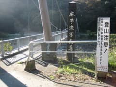 吊り橋を渡ると登山届のポストがあり、記入して提出する。東屋や七福神の石像のある渓谷沿いの遊歩道を歩くと、目の前にドーンと大きく麻苧(あさお)ノ滝が現れる。落差40mと言われ、黒光りする岩壁が迫力だ。