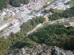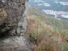 最初の難所を過ぎ、色付き始めた樹林の中の山道を登る。稜線に出て小さなピークに登ると、ザンゲ岩がある(登山道はピークをわずかに巻いているので、知らないと気付かずに通り過ぎるかも)。岩壁から突き出た岩場の上に立てば、期待通り、横川の街並が一望。足元が全く見えず、鳥になった気分が味わえるが、転落にはくれぐれも注意。