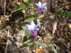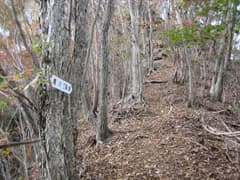 少し休憩したのち、丁須の頭に向かう。樹林に覆われた痩せ尾根上の小ピークを次々に越えて行く。5m程の垂直に近い鎖場は腕力で登る。その上にも5m程の鎖場が続く。足元の枯れ草の中には、リンドウがぽつぽつと咲いている。