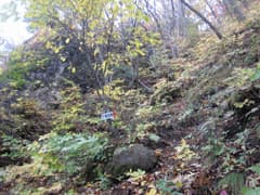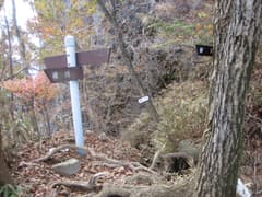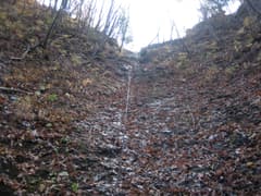鍵沢コースは、最初にスラブにかかった長い鎖場があり、足元が滑りやすい。おまけに、自分がさっきやったように、上から石が落ちて来ないとも限らないので、要注意箇所だ。ここを下ると、落ち葉に埋もれたガラガラの沢の下りになる。道標が随所にあるので、迷う心配はない。