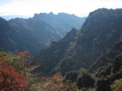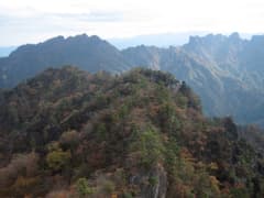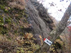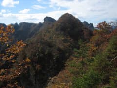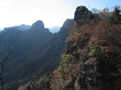 やがて、岩稜にかかった鎖場が現われる。左右に支えがあるチムニー内の鎖場より、いやーな感じ。気合いを入れて登る。この上も岩稜が続くが、難所は越えた。稜線の両側に、紅葉、岩壁、岩峰を眺めながら歩く。途中で年配の女性3人パーティとすれ違う。挨拶を交わした際、老婆心で「この先は怖い鎖場がありますよ」と付け加えると、「25mチムニー(たぶん、裏妙義縦走路にある鎖場)を越えたから、大丈夫じゃないかしら」とちょっと心配しながら降りて行った。