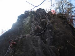 遊歩道から登山道に入ると、のっけから支流の滝の落ち口へトラバースする鎖場になる。濡れた岩は滑りやすく、いやらしい。さらに岩壁の基部を鎖を伝って登る。振り返ると、深い谷の奥に麻苧ノ滝が落ちている。うーん、さすが妙義の山は険しい。