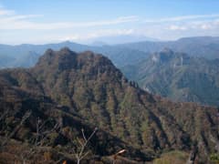 石祠のある小ピークを越えると、三角点と「御嶽神社」という石碑がある御岳の頂上に着く。眼下には妙義湖の水面、中木川の谷を隔てて表妙義の白雲山から金洞山、星穴岳にかけてのぎざぎざの稜線、それに丁須の頭の展望が良い。