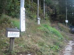 準備を整えて出発。吊り橋のたもとには、「登山注意!台風により登山道が大変荒れています。登山に注意して下さい。」という立て看板が設置されている。文中の『に注意』の箇所は、元は『を自粛』という文面で、その上にシールを貼って改訂してあった。