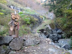 先程通り過ぎた大久保まで車道を歩いて戻り、ハイキングコースの大きな看板を見て脇道に入る。西上州の山村らしい、急傾斜の畑に民家が点在する風景に久し振りに出会う。車道の終点には数台分の駐車スペース(私有地?)と、道標、丸太で作られたユニークなフィギュアがある。いろいろなHPの山行記録を見ると、このフィギュアは結構なペースで新作が披露されているようだ。