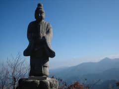 4人パーティの後から、のんびり山頂を出発する。P1をロープのあるトラバース道で巻き、登山道からちょっと脇に逸れたP2にも登る。途中には烏天狗の石像、頂上にはすまし顔の石像がある。こちらも展望が良い。