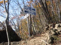 四ッ又山へは急な尾根を登る。まだ紅葉は残っているが、木々の葉はだいぶ落ちて、明るい陽射しが差し込んでいる。途中で、ご夫婦2組?の賑やかな4人パーティに追いつき、先に行かせて頂く。尾根を登り詰めると頂上直下に分岐がある。右へ少し登った所が四ッ又山頂上(P1)だ。