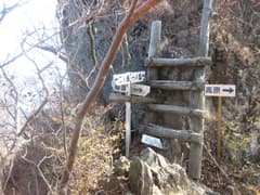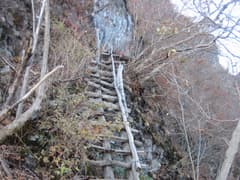 南峰基部の手前でランチ休憩の4人パーティに追いついて、先に行かせて貰う。見上げる一ノ岳の岩壁はすごい高さだ。ロープを伝って岩壁基部をトラバースし、二ノ岳(鹿岳本峰)との鞍部に出る。まずは一ノ岳に向かう。痩せ尾根を左に辿るとすぐに木の梯子があり、右に高原への下山路が分岐する。