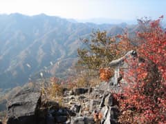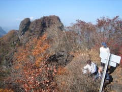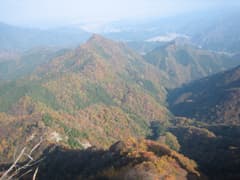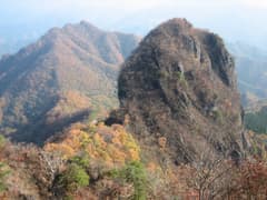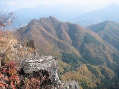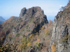 一ノ岳からの展望を堪能したのち、ちょうど4人パーティと入れ違いになって出発。鞍部に戻って二ノ岳に向かう。木の梯子を登り、岩壁の斜めのバンドを鎖を命綱にして登ると、眺めが開けた爽快な岩稜に出る。振り返ると、一ノ岳の崖っぷちの道を4人パーティが下っているのが見える。右手に見える痩せ尾根の山は紅葉が奇麗だ。しれいた山だろうか。