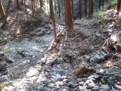 一ノ岳との鞍部に再び戻って、高原へ下る。最初は鎖のある岩場だが、すぐに杉林の中の急な下りになり、沢に降り立つ。台風で出水があったのか、ところどころ登山道がゴロゴロの沢になっている箇所があるが、踏み跡とテープに気をつけて下り、高原の登山口に着いた。車道を辿って南牧ハーブガーデンまでは、僅かな距離だった。