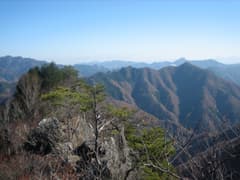 頂上から少し北に進んだ岩頭の上に立つと、日影山から塩ノ沢峠にかけての雑木林に覆われたなだらかな山並の眺めが良い。谷の底には住居附の集落を見おろす。西側の長野県境の山々の中では、御座山がひときわ高く目立ち、その右には白い八ヶ岳が頭をのぞかせていた。
