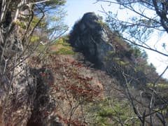 ところどころシラカバが混じる雑木林の尾根を登って行く。笠丸山の岩峰に近づくと、その陰に入って薄暗い尾根になる。岩場に突き当たり、右に回り込んで急登すると、祠のある東峰に登り着いた。