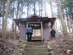 鳥居をくぐって、薄暗い杉林の中の参道を歩く。長い石段を登ると、小さな社殿のある古賀良神社に着いた。外見はトタン板で囲まれたごく普通の神社だが、格子窓の間から中を拝見すると大きな石宮があり、外側の社殿はその入れ物であることがわかる。東吾妻町HPの文化財紹介ページの記述によると、石祠は安永2年(1773年)に造られた物で、高さ約3m、その大きさは県内ではトップクラスのものとのこと。保護のためとはいえ、近くで見られないのはちょっと残念。