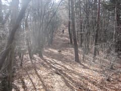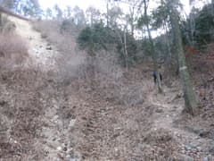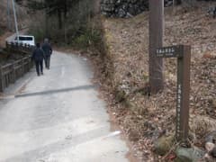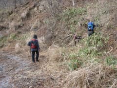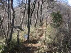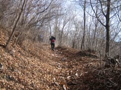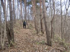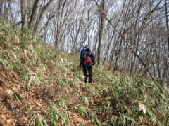 半時間弱で山腹を横切る林道に出る。吾嬬山へは林道を左右どちらでも行けるようだが、現地の道標によると左の方が近いようだ。林道を左に辿ると、すぐに道標があり、再び山道に入る。ところどころ背の低い笹原のある雑木林を登る。落葉が深い。