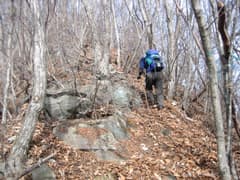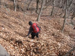 落葉を搔き分け、かさこそと尾根を登って行く。急登の箇所で枯れ木を手摺にするとポキポキ折れる。やがて、登りが緩んで肩に出る。頂上はあと少しの所だ。
