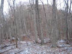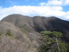 正月らしく初詣を終え、参道入口まで戻る。天狗山・鏡台山登山口の道標に従って、支流に沿った舗装道を登る。神社の賑わいから一転して、こちらは全く人がいない。地蔵峠への登山道を左に分け、工事中の砂利道になると「←天狗山」という道標があり、登山道は左に入る。行く手の鞍部を目指して、雑木林の疎らな谷を登る。右に見上げる鏡台山北峰は岩壁をかかげている。