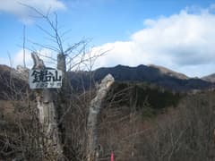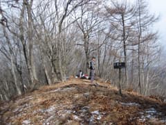 ここまでは誰にも会わない静かな山だったが、頂上からは何やら人声がする。どうも子供が大勢いるようだ。痩せた尾根を登ると、右から急な登りの道を合わせる。道標があり、寺社原・大竹からの道らしい。そして、そちらから地元?の方々が続々登って来ていた。頂上はそのすぐ上だった。