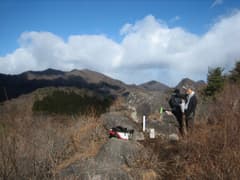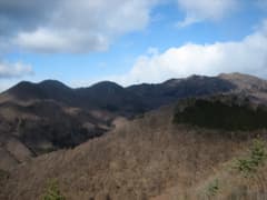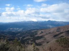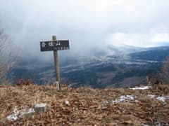 頂上には露岩と四等三角点があり、周囲の眺めが開けている。北には青空と白い雲を背景にて掃部ヶ岳と杏が岳。そこから左回りに、浅間隠山、角落山、後ろには雪雲がかかった浅間山が控えている。西上州の山々は妙義山をはじめとして、ぎざぎざの稜線がたくさんだ。山麓の眺めもいい。鏡台山から鐘原ヶ岳、天狗山にかけての山々も、こじんまりとしているが雑木林が奇麗で、里山ハイクに良さそうだ。この山頂はとても気に入った。